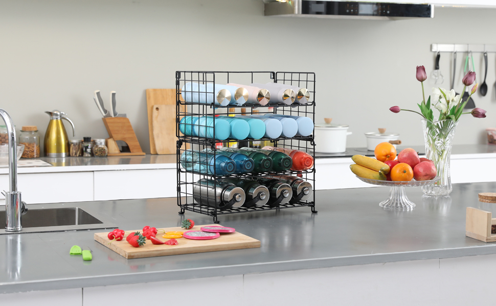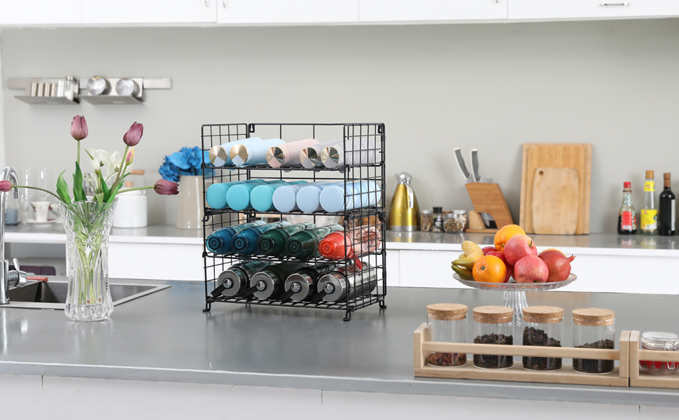 【Powerful Storage Function】Are you still worrying about cluttered cabinets or Countertops? water bottle organizer are the perfect solution to keep you organized and great for storing reusable water bottles,wine bottles,soda,fitness drinks,etc.Suitable for kitchen countertops, pantry, cabinet