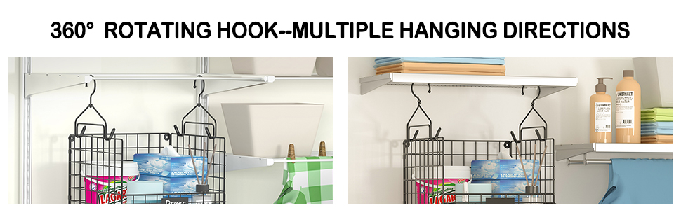 【2 Rotating hook】 The hook can rotate, and can hang horizontal and vertical bars, which is suitable for all baskets that can be hung at home.Laundry basket with 5 S hooks, you can hang items on the side.