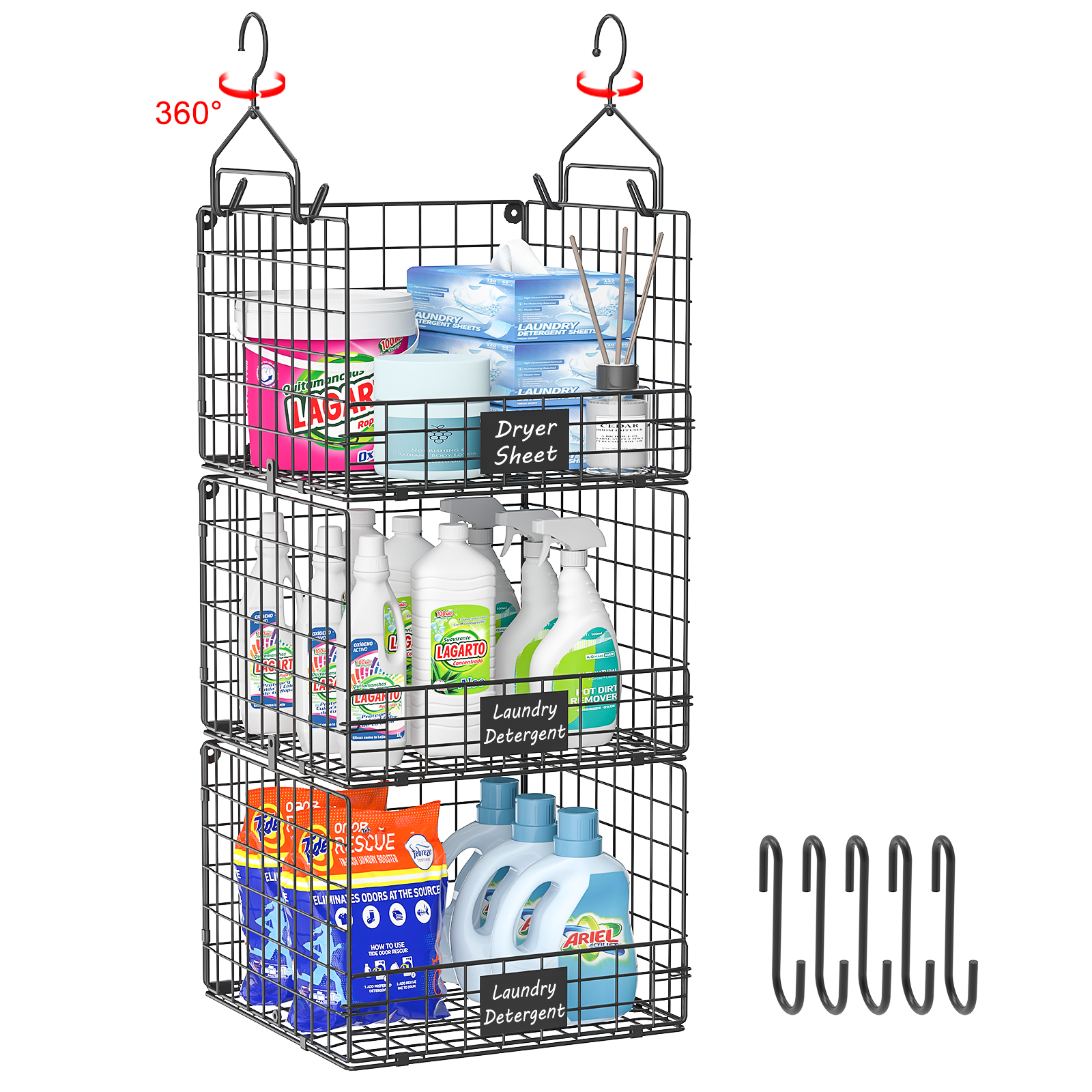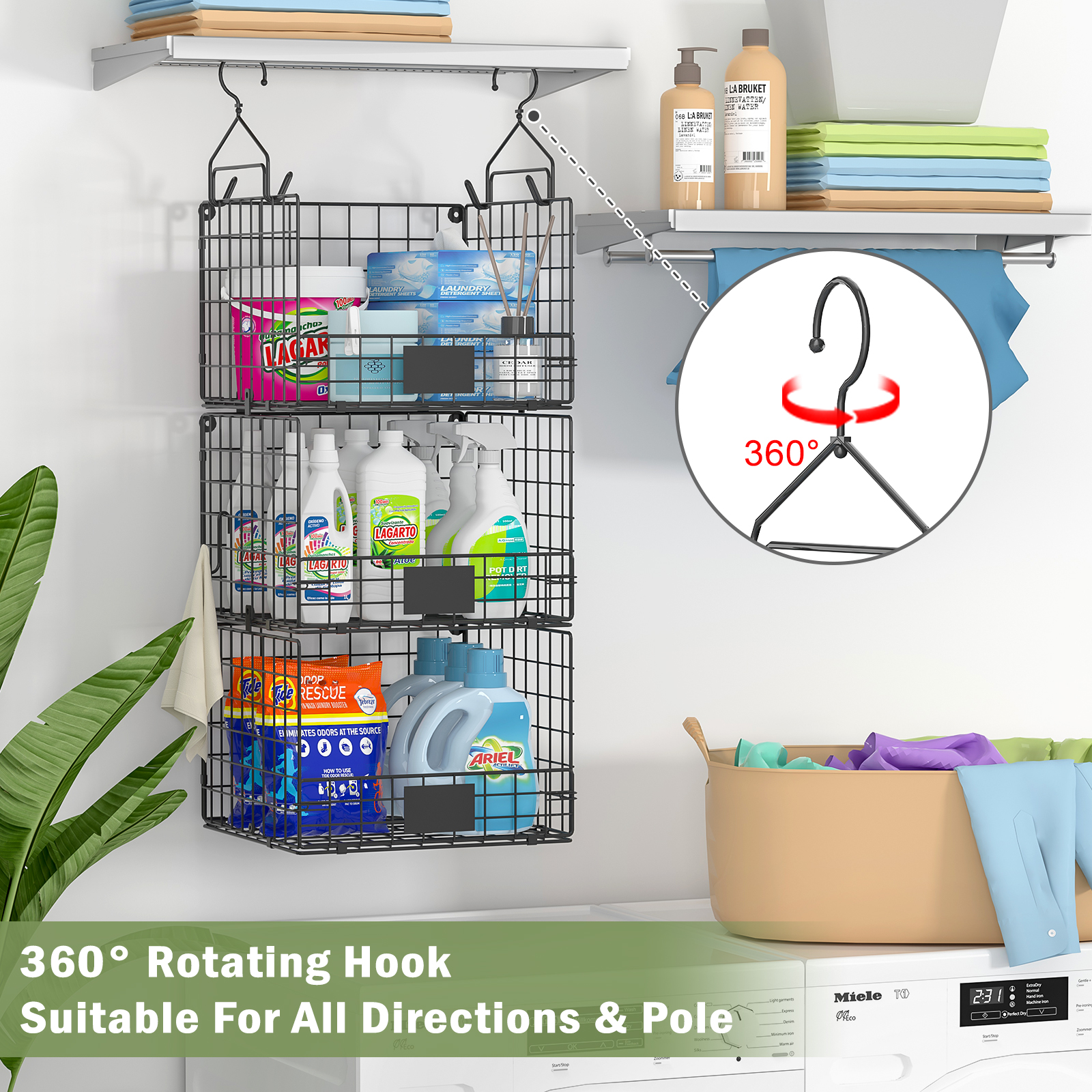 【Used separately or stacked】 Laundry room organizer can be hung with 2 rotating hook,installed on the wall,or placed on the ground. The three baskets can be used separately or stacked.