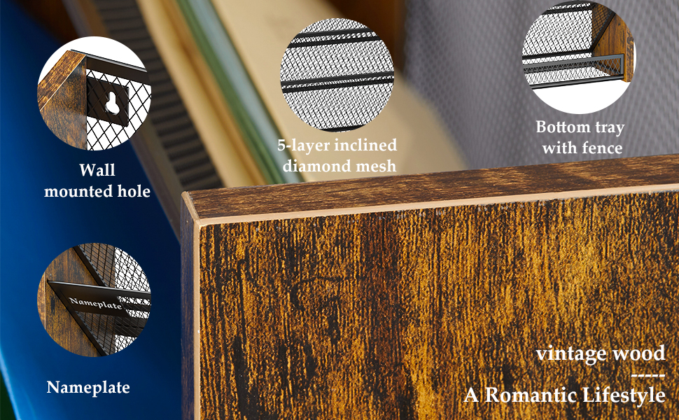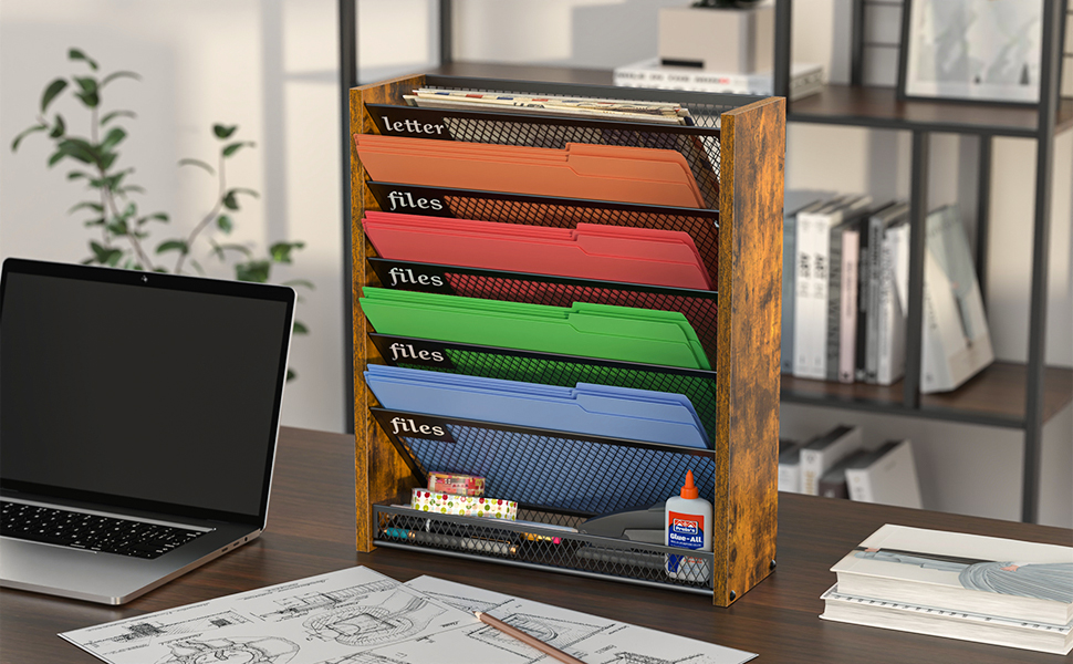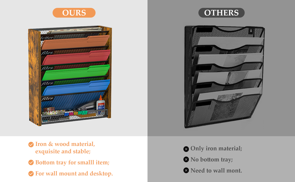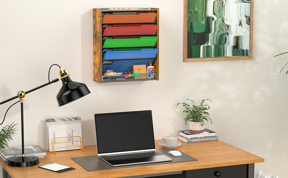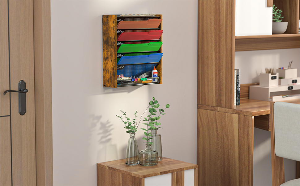 Wall File Organizer * With its combination of iron and wood materials, The Vintage wood laminate slats are a rich beautiful brown color. It's not only functional and durable but also stylish, adding a touch of elegance to your décor. * The five pockets provide ample space to store all of your important files and documents. * Nameplates making it easy to find what you need when you need it. The wall-mounted design makes the most of your space, freeing up valuable desk or countertop space. * This file holder sits at your desk and is an attractive addition to your office space. Very sturdy and attractive.